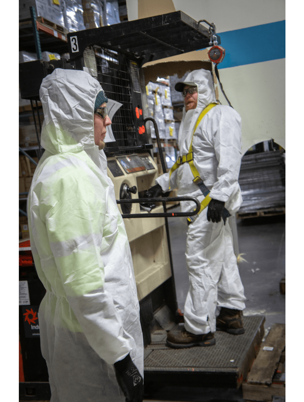 These non-woven coveralls are great for those who need a durable disposable coverall that provides protection against light liquid splashes, debris, and dry particulates. They are low-lint, have serged seams, and are a white, 55-gram SMMS material. The coveralls have a hood, a reinforced triangle crotch, and elastic on the hood, ankles, waist, and wrists for a secure fit. The zipper closure has a storm flap to keep particles out. These coveralls comply with FDA regulations for food contact.