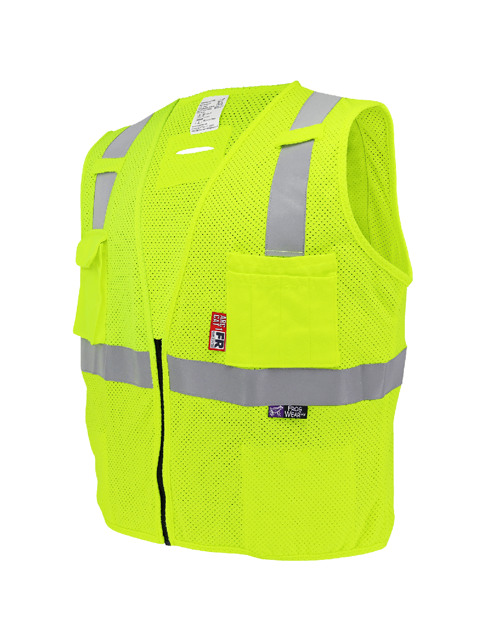 This flame-resistant surveyor's safety vest is high-visibility yellow/green anti-static mesh modacrylic/cotton. The silver FR reflective material provides enhanced visibility in low-light conditions. Features include a D-Ring opening on the back and mic tabs on the shoulders. Two outside and two inside pockets include an outer left breast pocket with two tiers and four pen/marker holders. The black FR zipper closure provides easy donning and doffing while keeping the entire vest flame-resistant. This vest uses a patented material process for customized protection.
