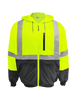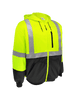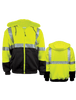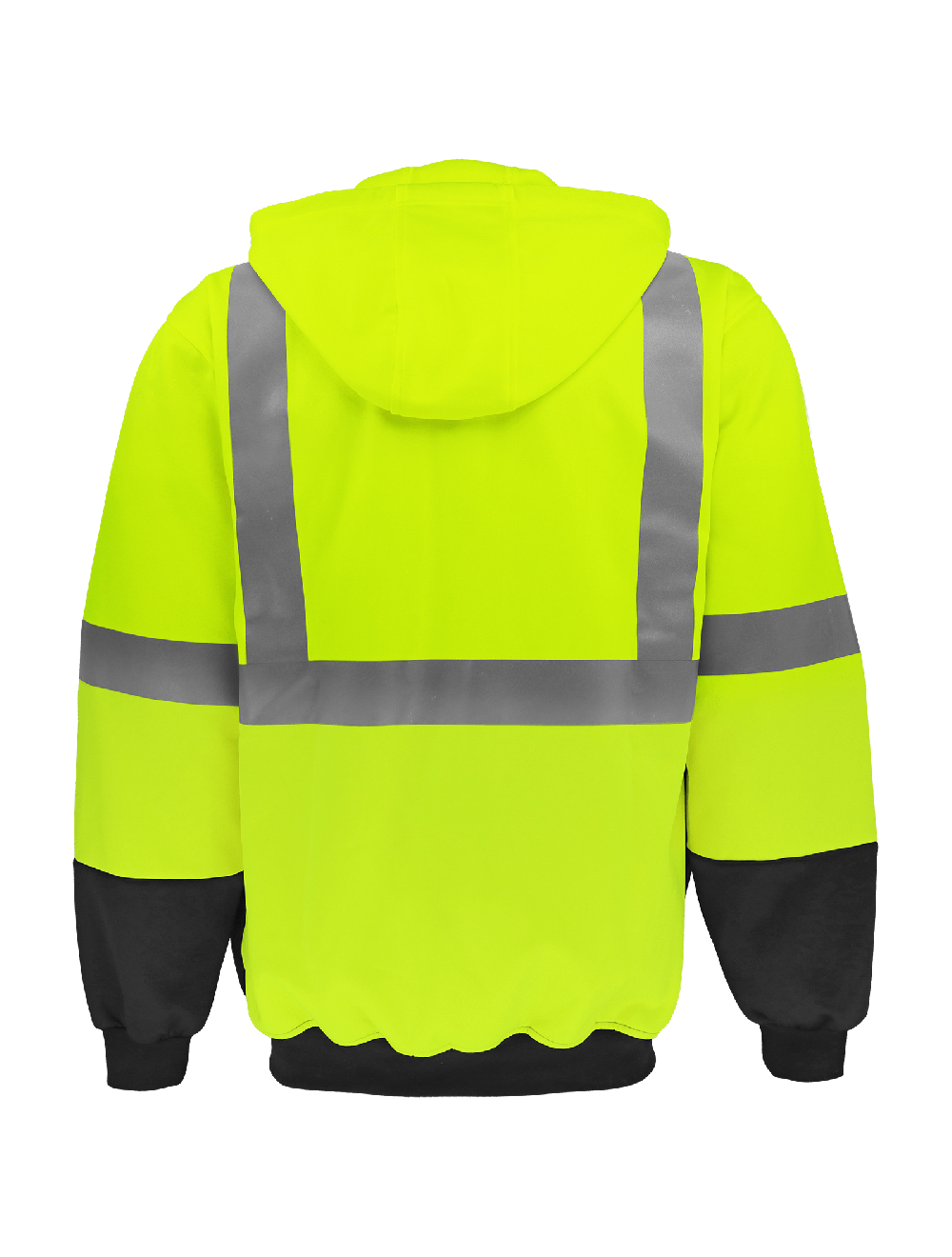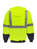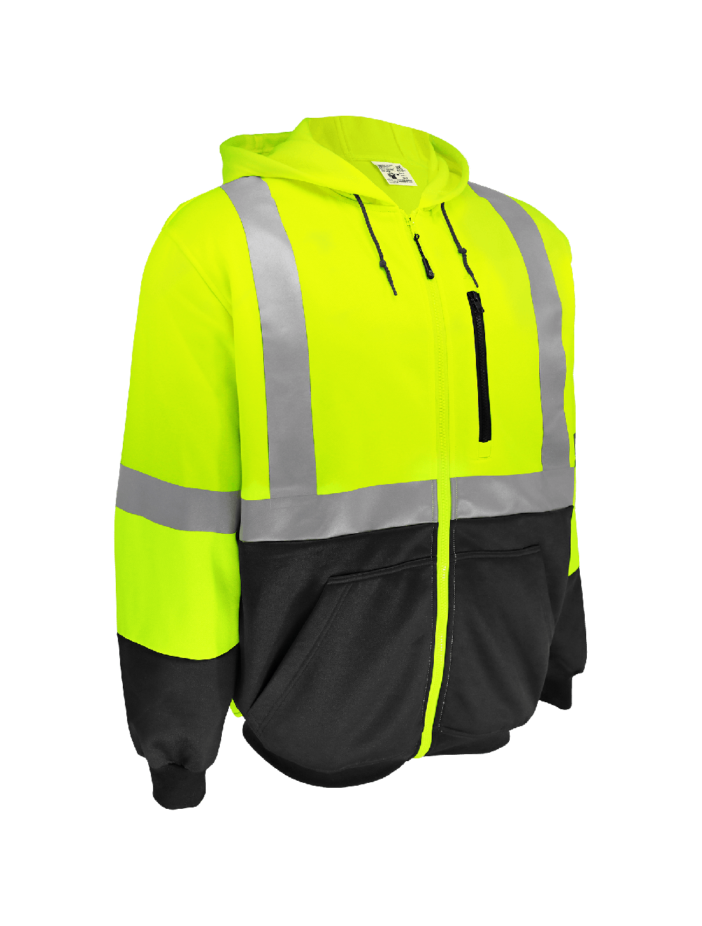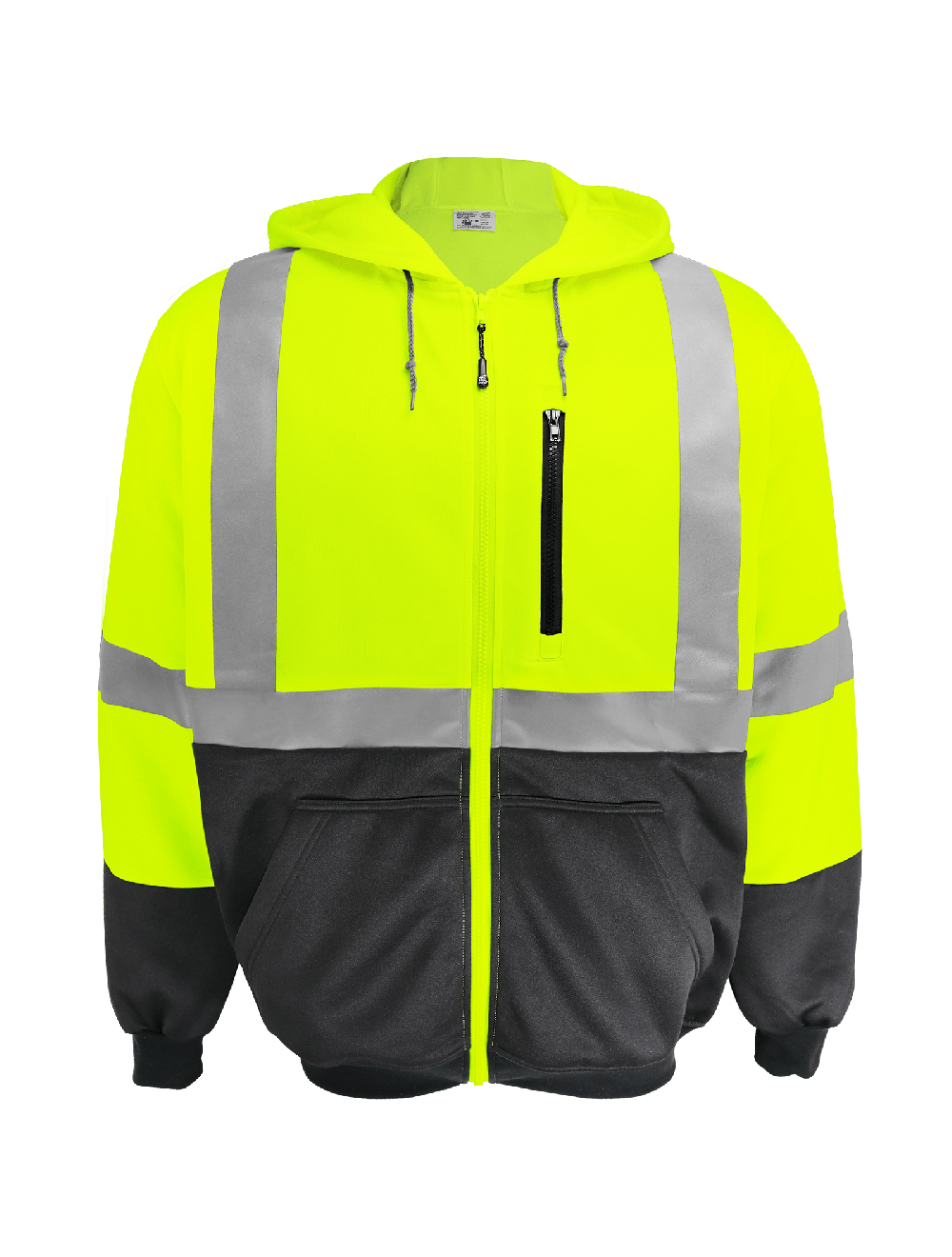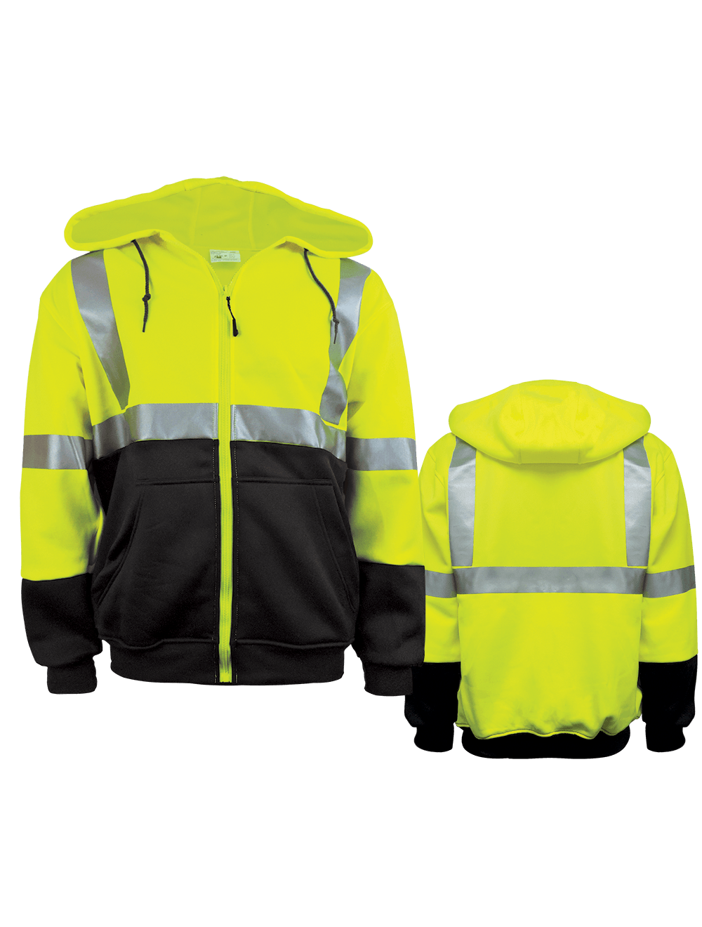 This high-visibility yellow/green hooded sweatshirt is anti-pilling polyester fleece. The black sleeve ends and bottom front hide dirt for a cleaner appearance. Silver reflective enhanced low-light visibility. Includes a ribbed bottom and sleeve cuffs help to keep the cold out. The sweatshirt features a drawstring hood, a zipper closure, and two outer pockets.