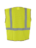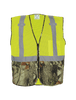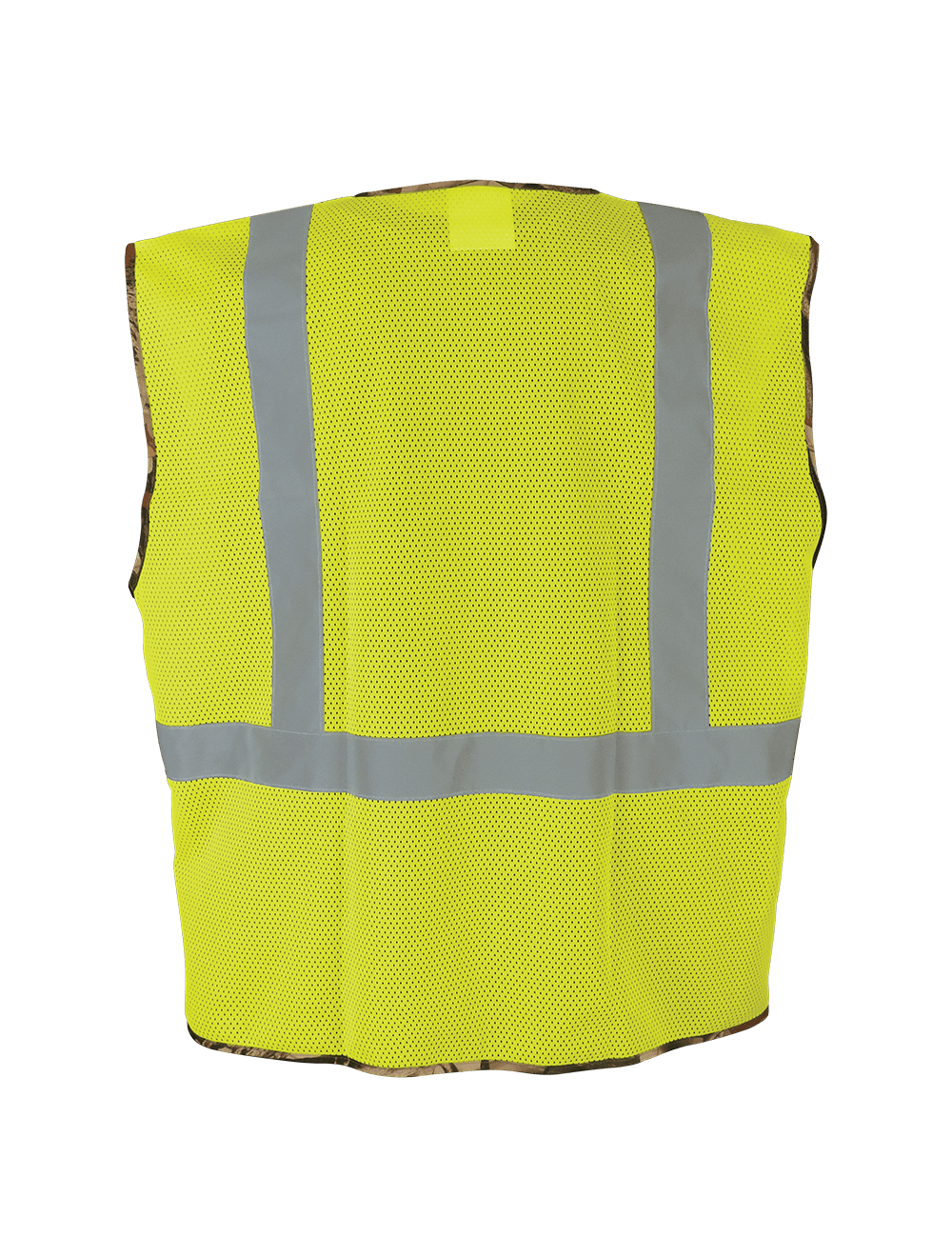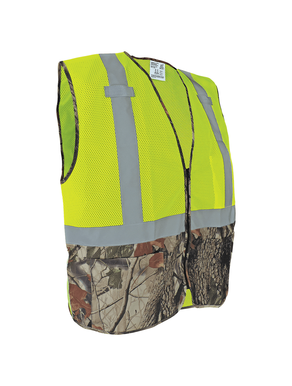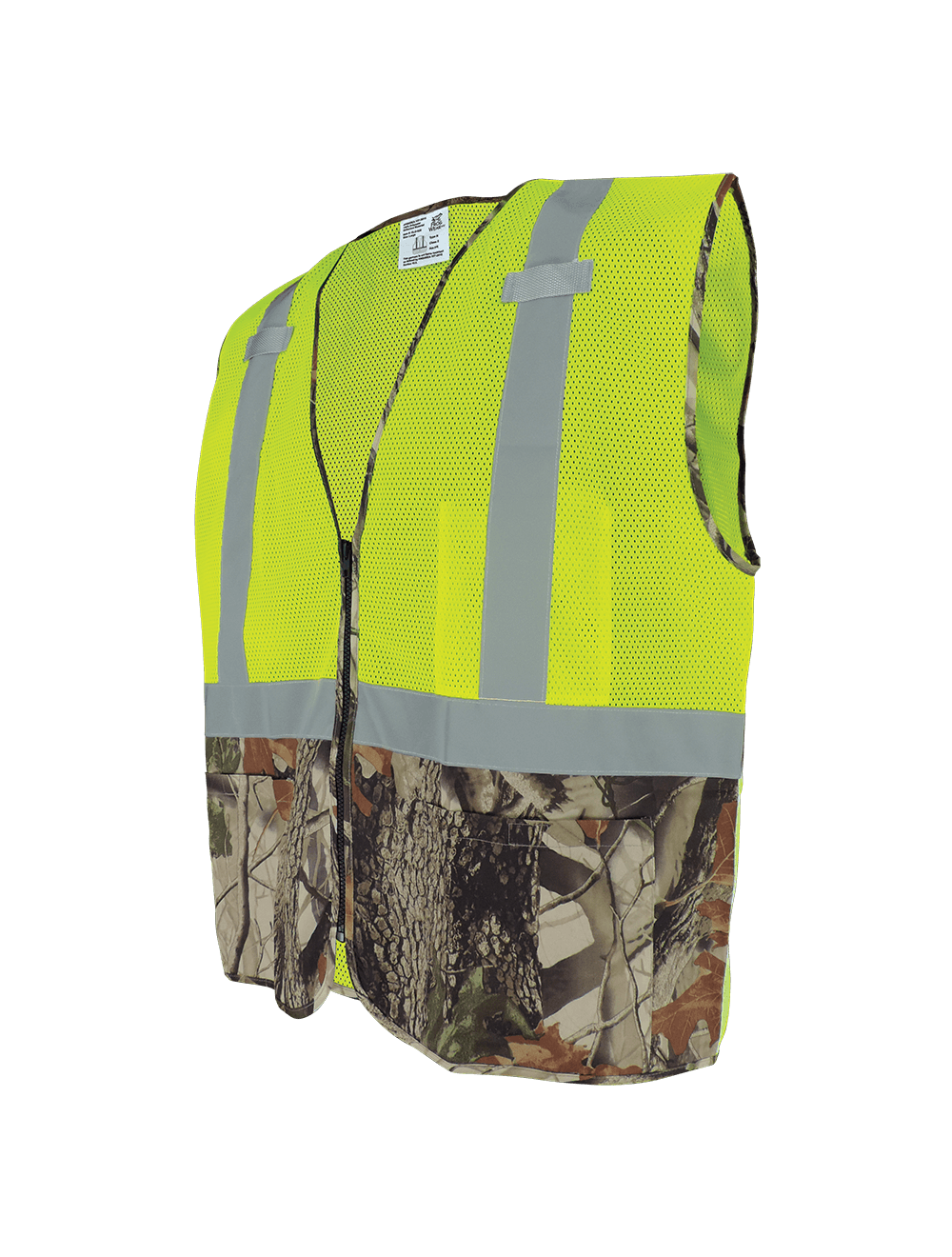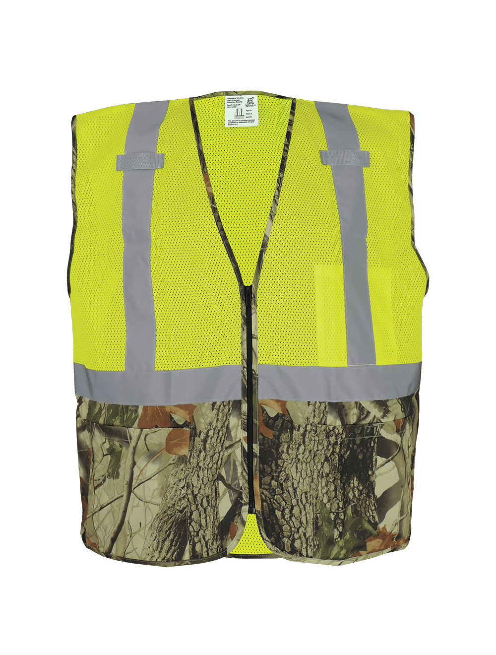 This high-visibility yellow/green safety vest is lightweight polyester with a mesh front and back and a camouflage solid bottom front. Silver reflective material enhances low-light visibility. This vest features mic tabs on the shoulders, two outside and one inside pocket, and a zipper closure.