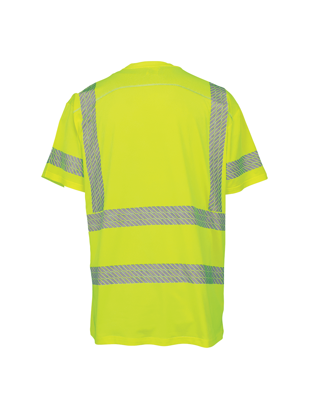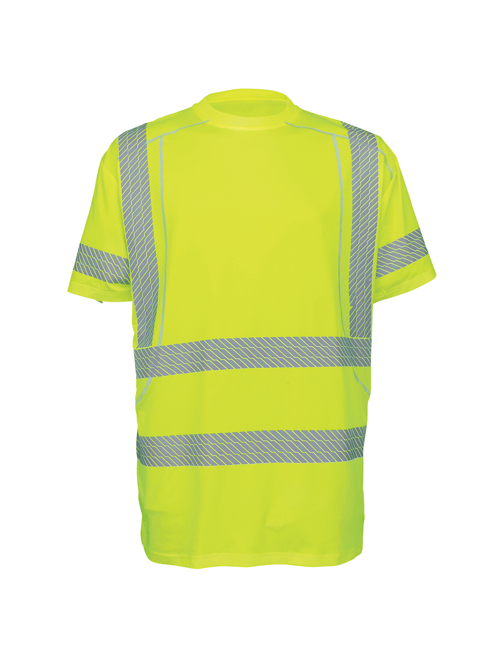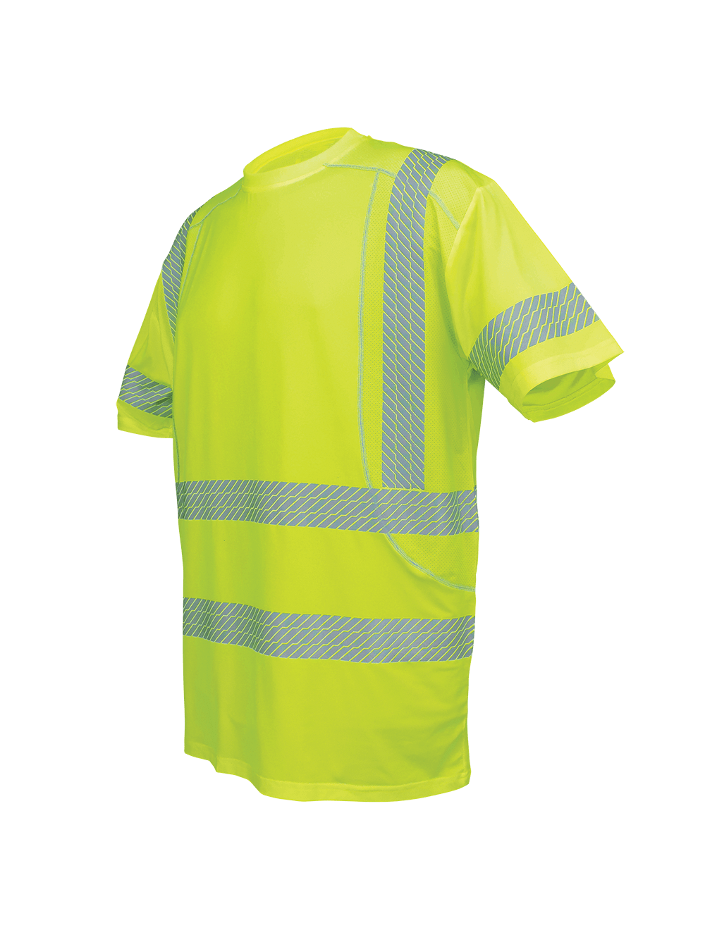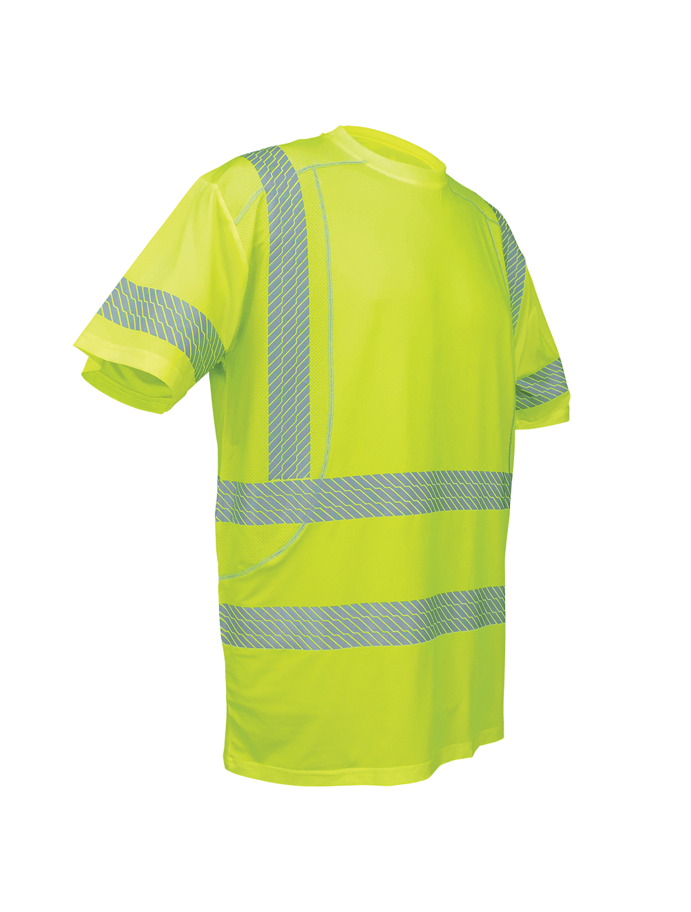 This premium athletic-type short-sleeved shirt is high-visibility yellow/green self-wicking high-performance stretch polyester/spandex microfiber. The breathable mesh material on the upper back and sides allows more airflow. Segmented silver reflective material increases visibility in low-light conditions. This shirt features UPF 15+ sun protection and a comfortable tagless design.