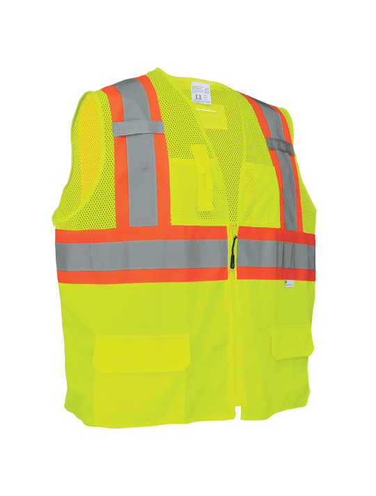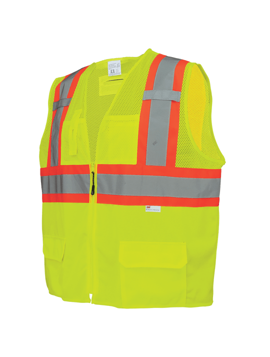 This surveyor's safety vest is high-visibility yellow/green lightweight polyester with a mesh top and a solid bottom. The 3M™ reflective material with contrasting orange trim enhances visibility in low-light conditions. The vest features a D-Ring opening...Regular price $12.48 -