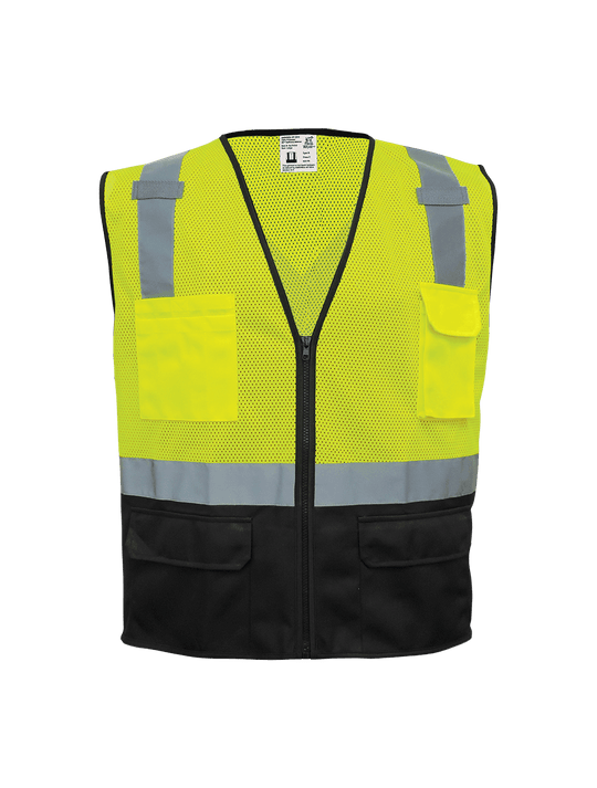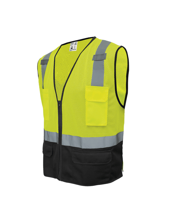 This high-visibility polyester safety vest has an x-back design. It is high-visibility yellow/green with a black bottom front. Featuring six pockets, mic tabs on the shoulders, and a zipper closure. The silver reflective ensures enhanced visibility...Regular price $14.10 -