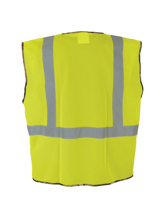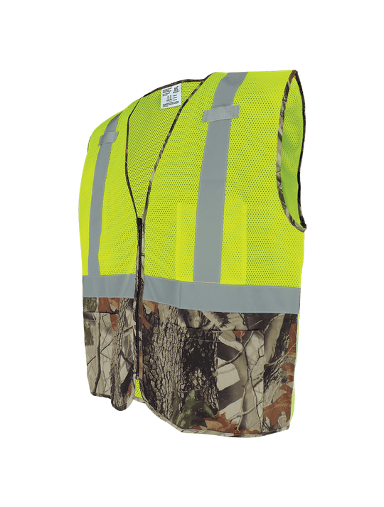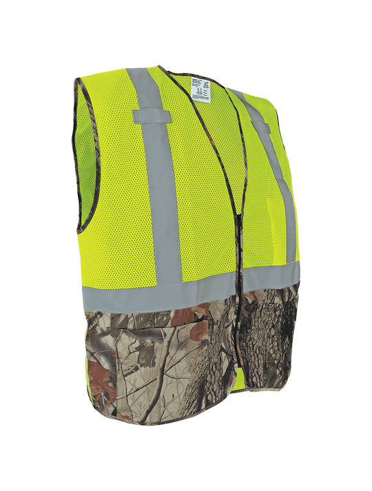 This high-visibility yellow/green safety vest is lightweight polyester with a mesh front and back and a camouflage solid bottom front. Silver reflective material enhances low-light visibility. This vest features mic tabs on the shoulders, two outside...Regular price From $3.04 -