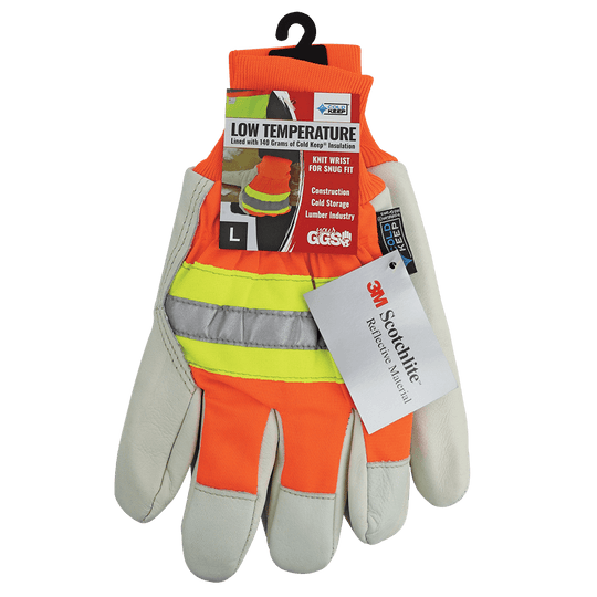 These low-temperature standard-grade beige grain cowhide leather gloves have 140 grams of Cold Keep® insulation for a lining. They feature 3M™ Scotchlite™ reflective knuckle tape contrasting yellow/green trim on a high-visibility orange nylon backing for added visibility in...Regular price $7.95 -