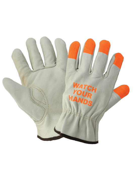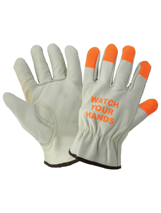 These standard-grade beige grain cowhide driver-style gloves have an ergonomic keystone thumb. High-visibility orange fingertips and "Watch Your Hands" text stamped on the back of the hand to help workers keep their hands in safe locations....Regular price $9.78 -