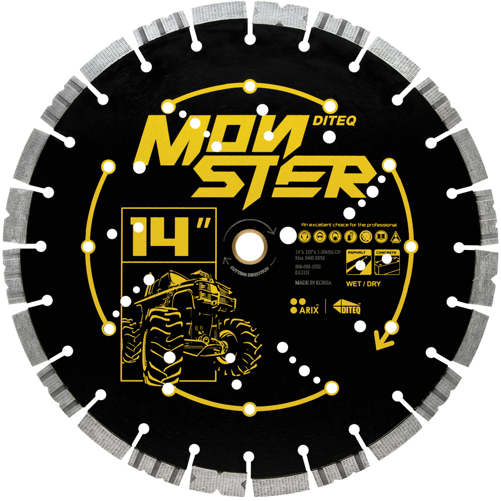 Monster Arix gives Faster Cutting Speed and Longer Blade Life with precise diamond arrangement throughout each segment for unequaled performance. wet/dry Concrete & Asphalt blades