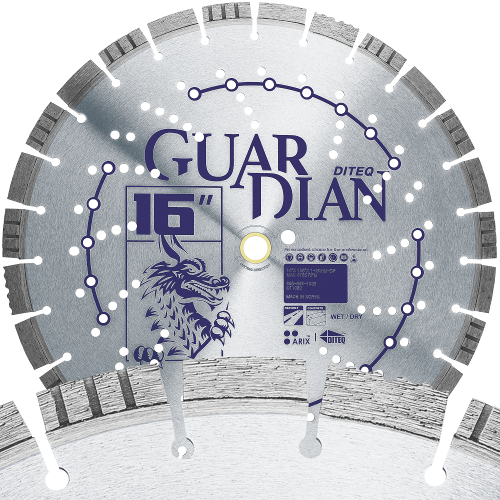 Use on high speed saws, Masonry saws and 20 Hp and lower walk-behind concrete saws. The Guardian is designed to cut: Pavers, Cured Concrete, Brick, Block, Green Joints, Limestone, and Asphalt While the Air-cooled structural core prevents overheating. Titanium coated GE diamonds for optimal segment strength. ARIX diamond arrangement technology for faster cutting speed and longer blade life.