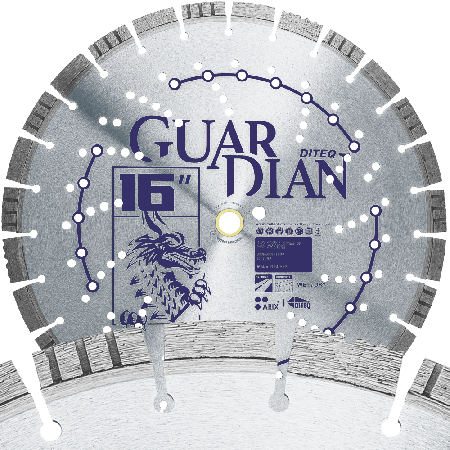 Use on 20 HP and lower walk-behind concrete saws. The Guardian is designed to cut: Pavers, Cured Concrete, Brick, Block, Green Joints, Limestone, and Asphalt While the Air-cooled structural core prevents overheating. Titanium coated GE diamonds for optimal segment strength. ARIX diamond arrangement technology for faster-cutting speed and longer blade life.
