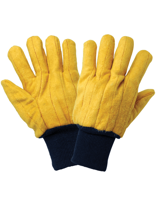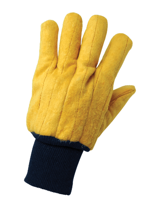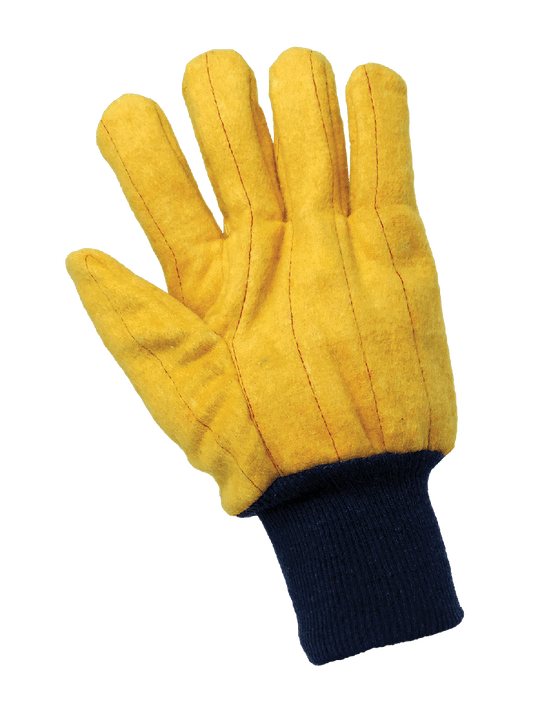 These two-ply quilted cotton yellow chore gloves feature a navy blue knit wrist, clute cut, and a straight thumb. Features Durable 14.5 oz. two-ply quilted cotton Clute cut with a straight thumb for a better grip...Regular price $2.91 -