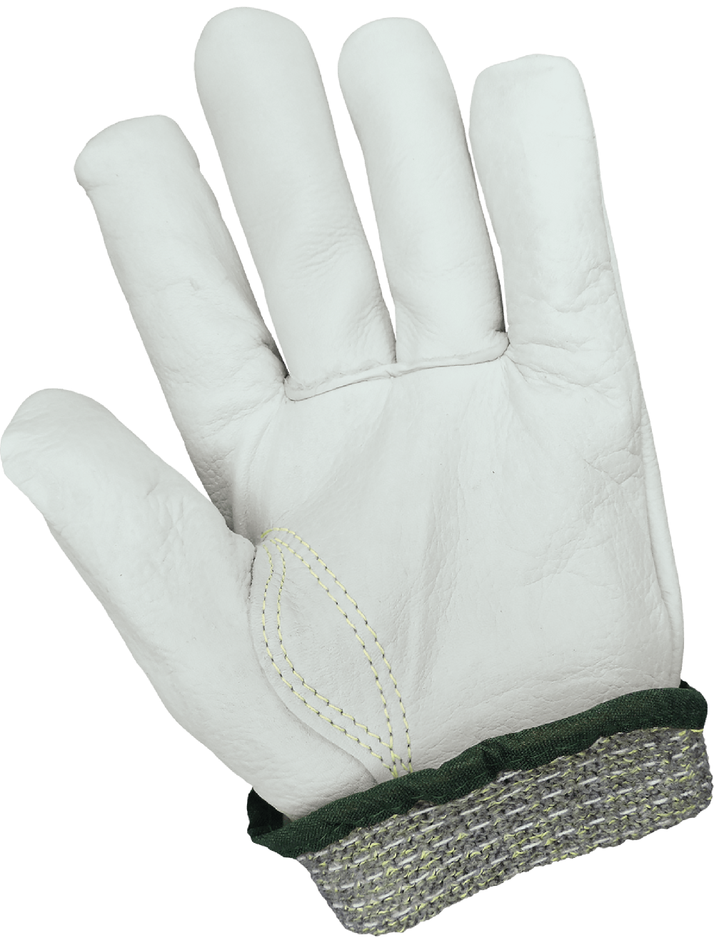 These cut-resistant, heat-resistant, and flame-resistant driver's gloves feature an Aralene® (enhanced aramid fiber) cut-resistant inner liner. The premium-grade beige grain cowhide leather shell has a gunn-cut pattern. These gloves have a keystone thumb for an ergonomic fit and an open cuff. This glove is sewn with aramid fiber and is great for industrial jobs and work requiring cut protection.