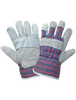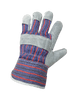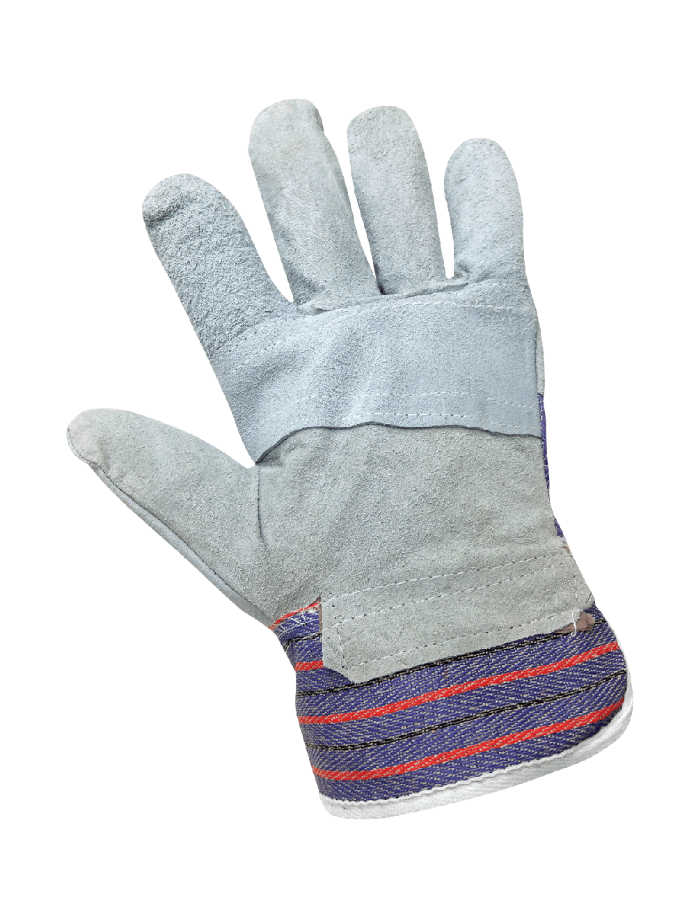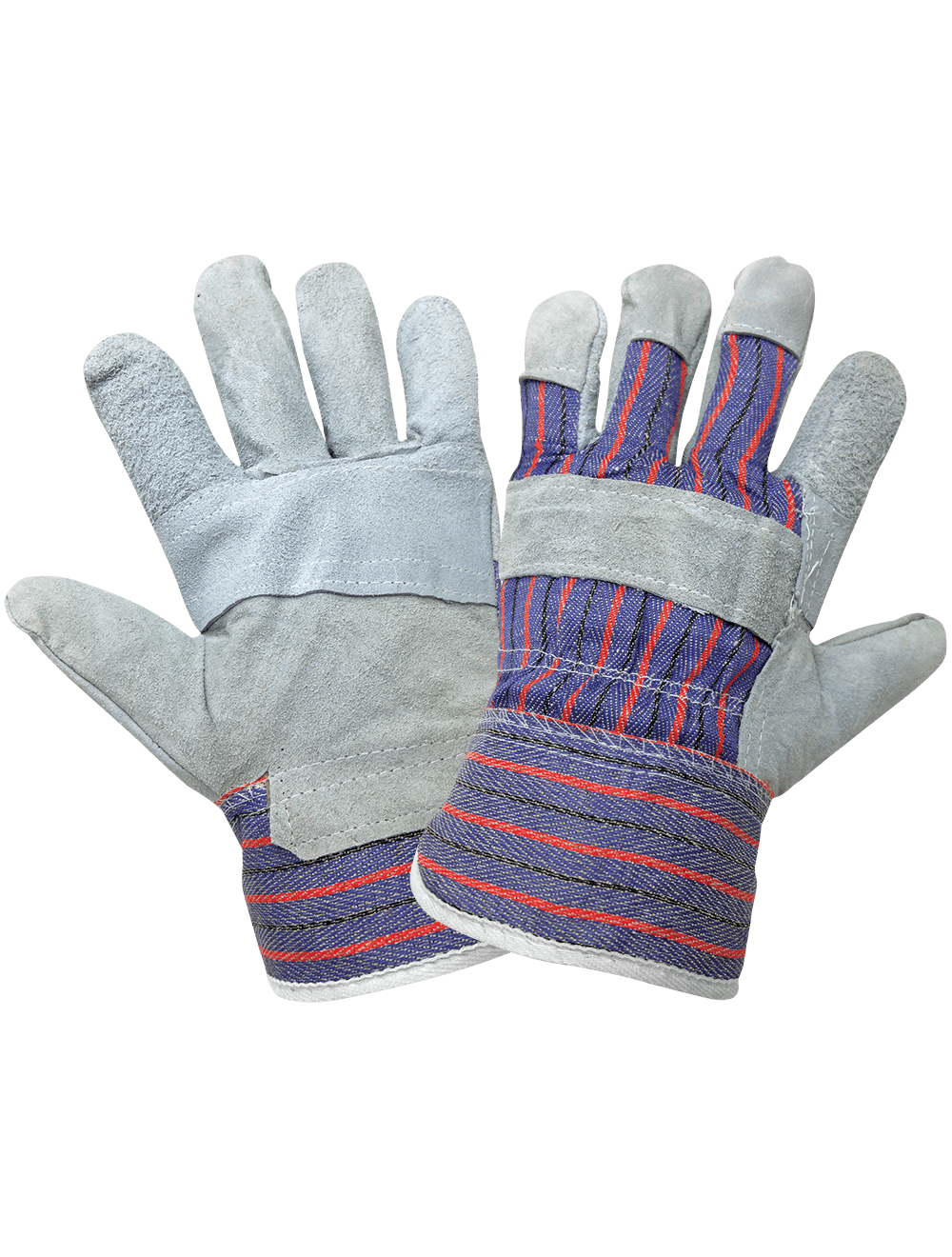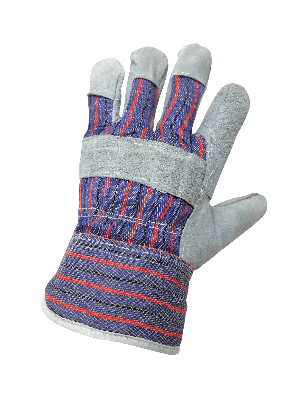 These Gunn-cut leather patch palm gloves have an economy-grade gray split cowhide leather palm and a 7-ounce blue/red/black striped cotton back. A leather knuckle band increases protection on the back of the hand. The wing thumb reduces hand fatigue, and the safety cuff is starched to retain shape.