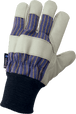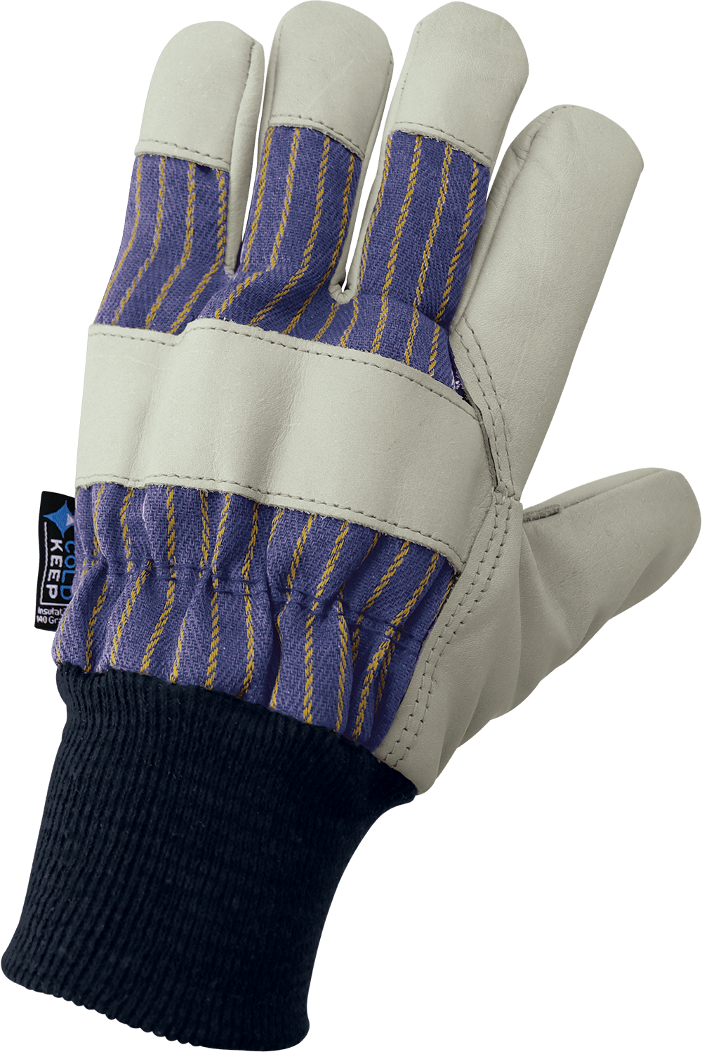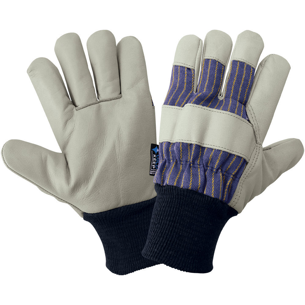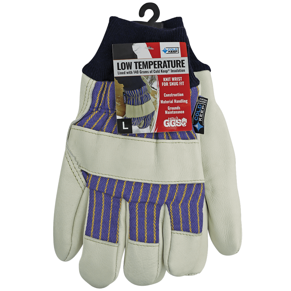These low-temperature gloves have a standard-grade beige grain cowhide leather palm and 140 grams of Cold Keep® insulation. The Gunn-cut gloves feature a blue/yellow striped canvas back with a leather knuckle band for added durability. The wing thumb provides flexibility, and the knit wrist has a comfortable, secure fit.