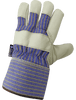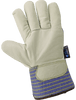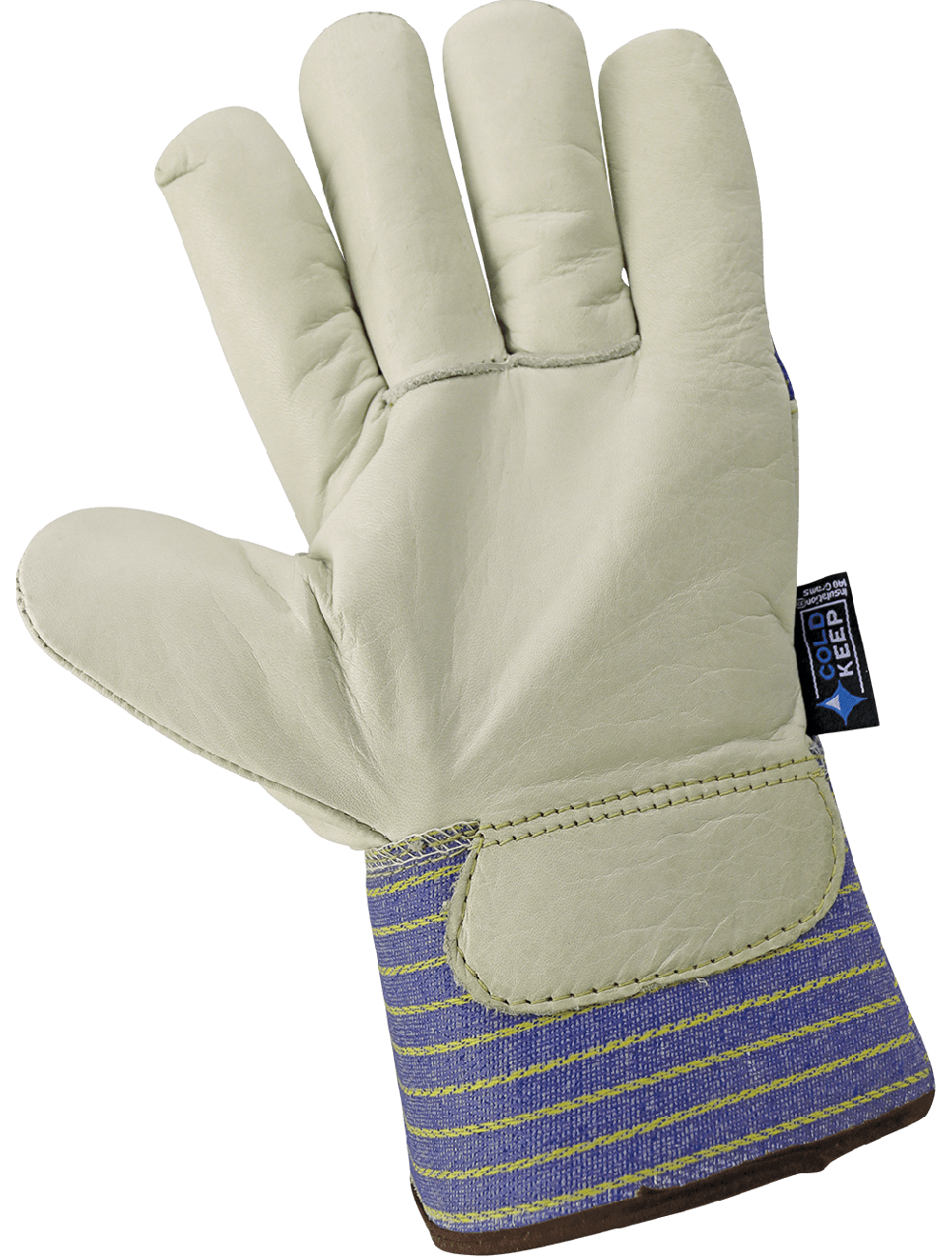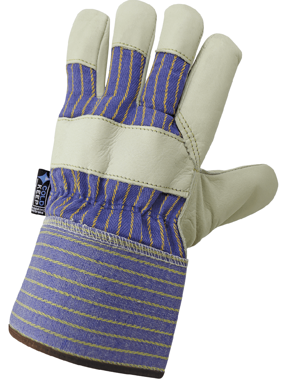 These low-temperature gloves have a standard-grade beige grain cowhide leather palm and 140 grams of Cold Keep® insulation. The Gunn-cut gloves feature a blue/yellow striped canvas back with a leather knuckle band for added durability. The wing thumb provides flexibility, and the safety cuff allows quick removal.