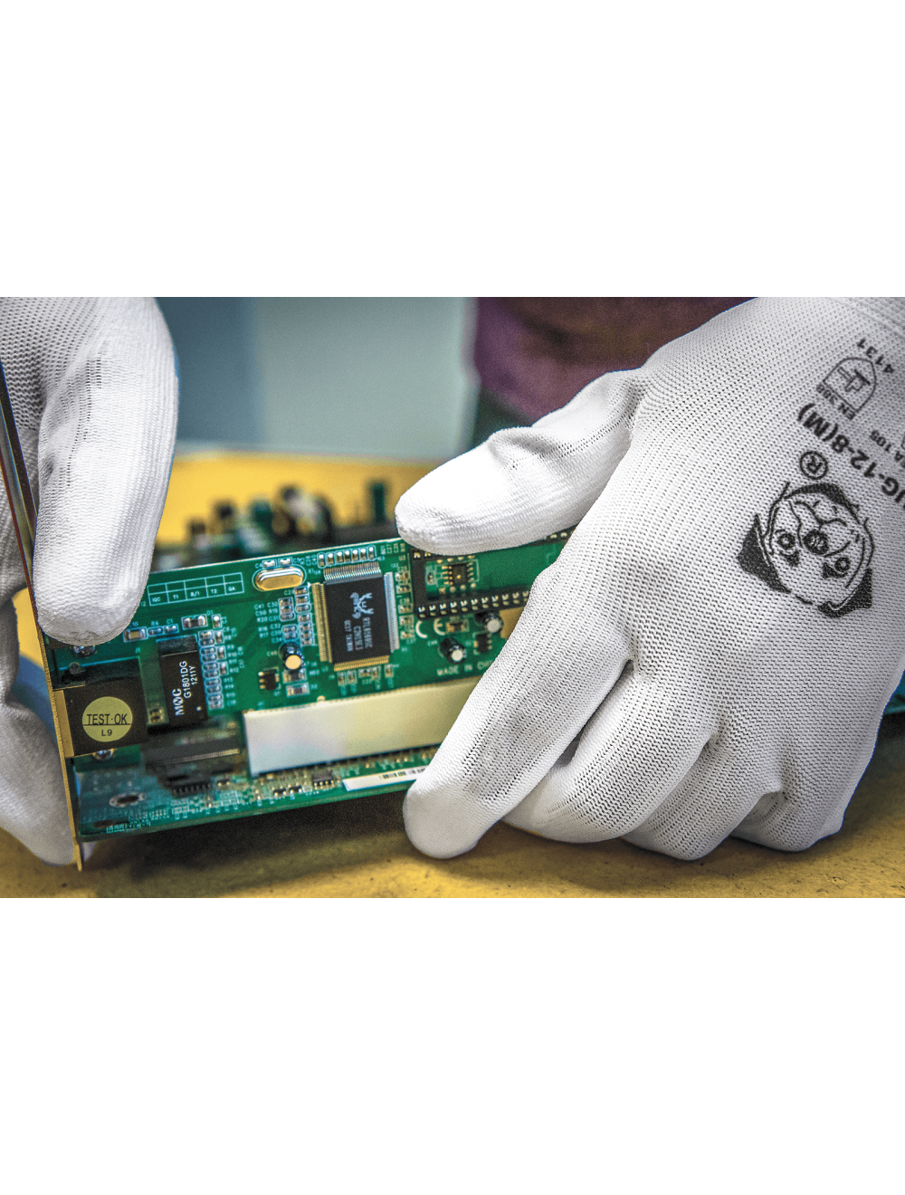 This lightweight, seamless glove is a general-purpose option with a 13-gauge white nylon shell. The palm has a white polyurethane coating with a smooth finish for enhanced grip. A knit wrist cuff provides a comfortable, secure fit. These gloves are anti-static/electrostatic compliant for use in an ESD protected area.