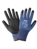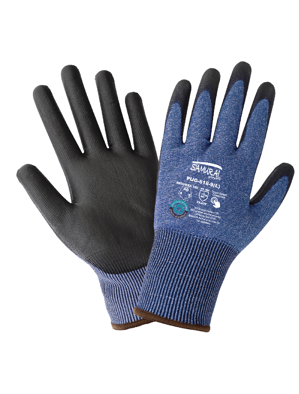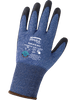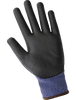These cut, abrasion, and puncture-resistant gloves are FDA food contact compliant and feature an 18-gauge blue-and-black seamless Tuffalene® UHMWPE/rPET shell. Each pair of gloves helps to reduce 7.98 grams of carbon dioxide emission. The palm coating is black, smooth polyurethane. The gloves feature touch-screen compatible fingertips and a knit wrist for a secure, comfortable fit.