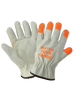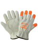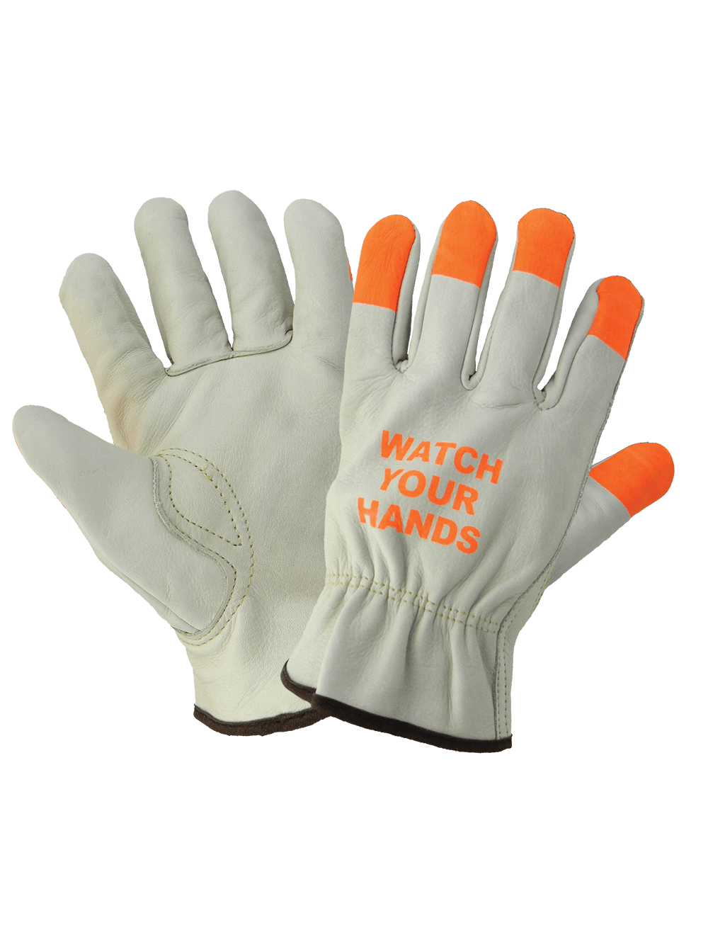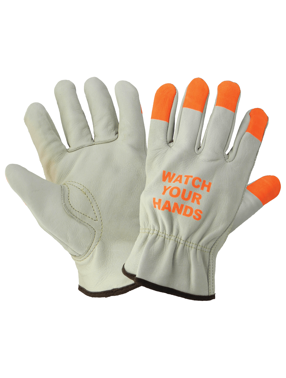 These standard-grade beige grain cowhide driver-style gloves have an ergonomic keystone thumb. High-visibility orange fingertips and "Watch Your Hands" text stamped on the back of the hand to help workers keep their hands in safe locations. The gloves have a gunn cut pattern and an open cuff.