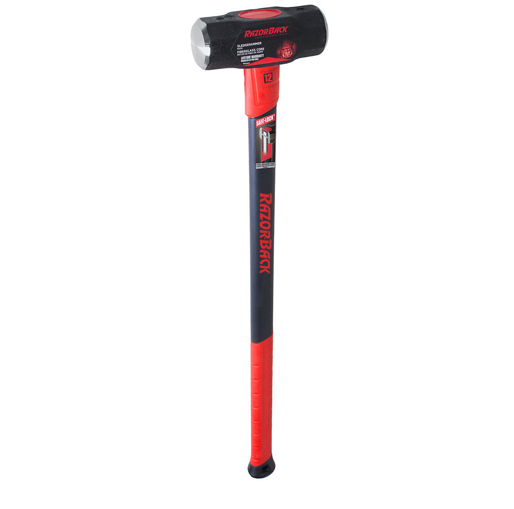 The Razor-Back #12 Sledge Hammer is constructed with a 34" fiberglass handle and forged steel head. This sledge hammer is ideal for demolition of concrete, tile, and drywall. The patented head to handle connection has a reinforced steel pin for improved safety and is a great choice for professionals.