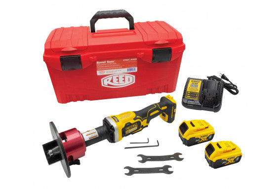 - Cordless tool deburrs and bevels plastic pipe quickly.