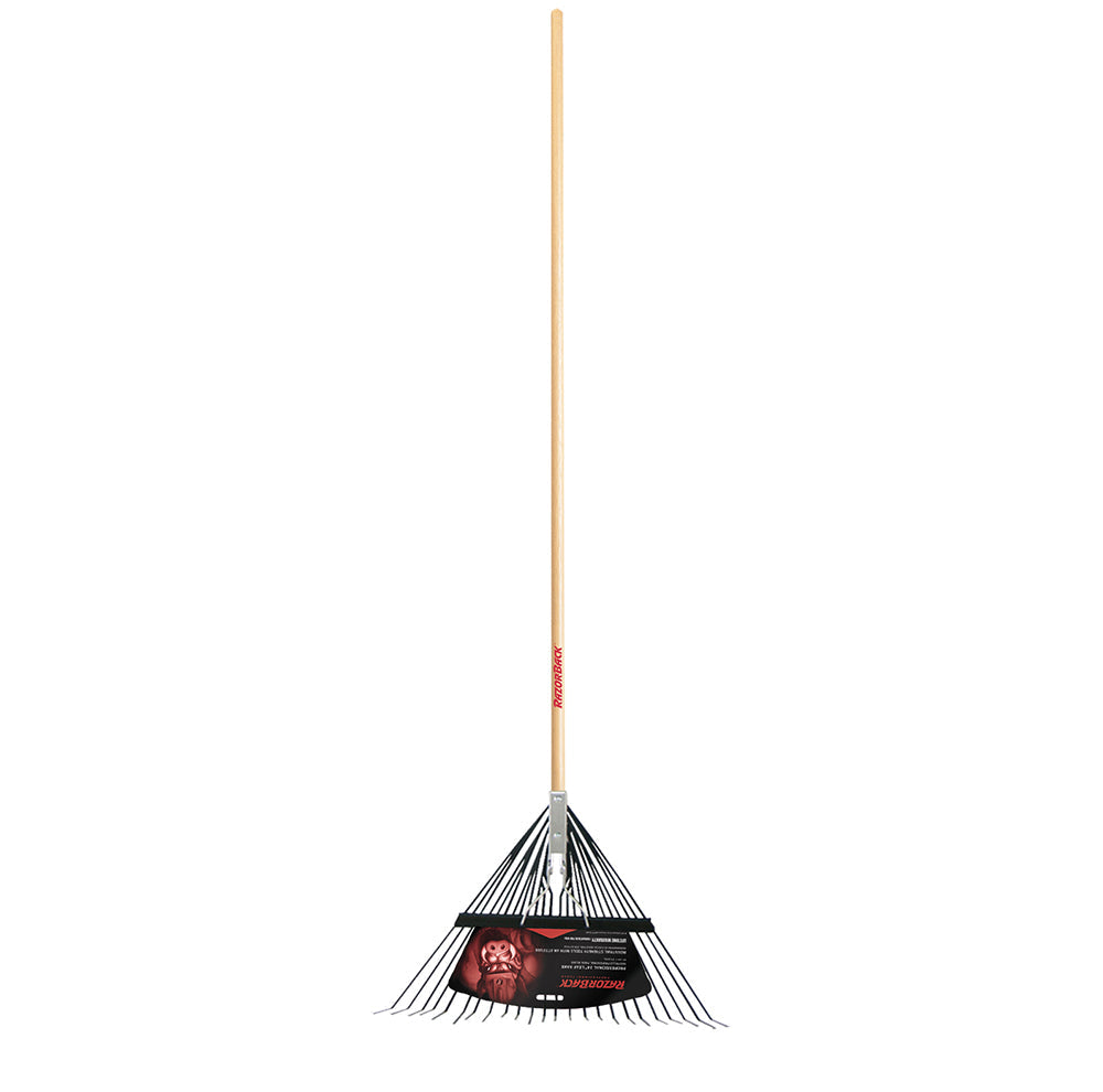 The Razor-Back 24-tine steel leaf rake is used for clearing leaves and debris from lawns. The flexible steel tines will pull out thatch for a healthier lawn. The steel head is bolted to the handle for a secure connection while raking.