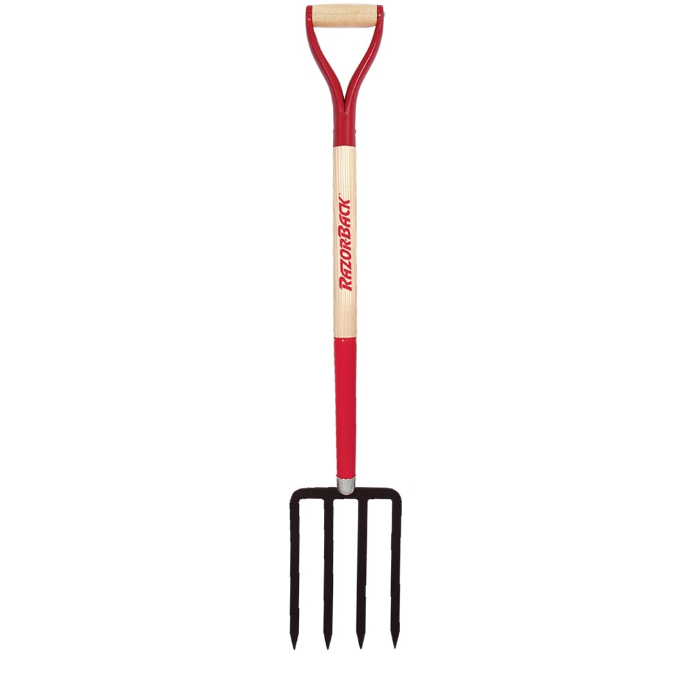 The Razor-Back spading fork is a multipurpose tool that can be used for turning, digging, and loosening all types of soil. It can also be used to transfer loose material. The forged head contains 4 diamond-shaped tines for maximum strength and durability.