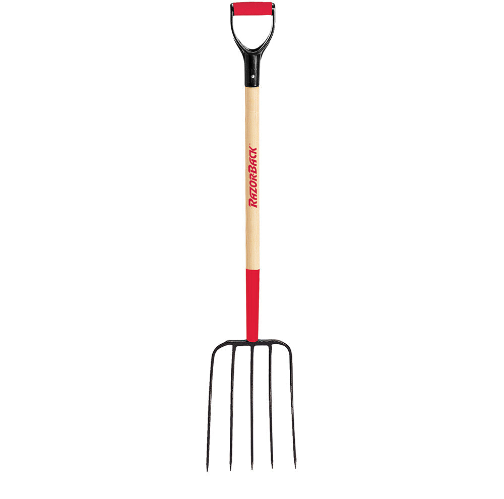 The Razor-Back compost fork is used for transferring manure, mulch, and other loose materials. The forged, 5-oval tine head is mounted to a 36" hardwood handle with steel ferrule and cushion D-grip.