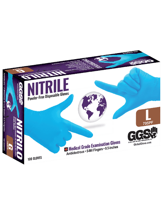 Global Glove Nitrile, Powder-Free, Medical-Grade, Blue, 5-Mil, Textured Fingertips, 9.5-Inch Disposable Examination Gloves