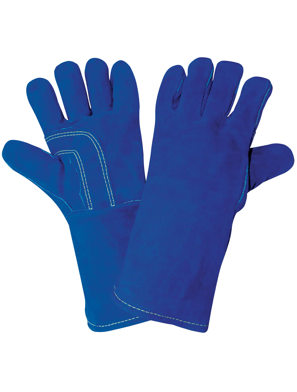 The premium grade leather welders gloves, blue color, featuring a reinforced palm, stitches that are sewn with Aramid fiber, welting in all vulnerable seams for added wear and protection, and a full semi-sock thermal-knit cotton lining for comfort and added heat protection.